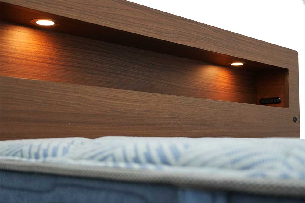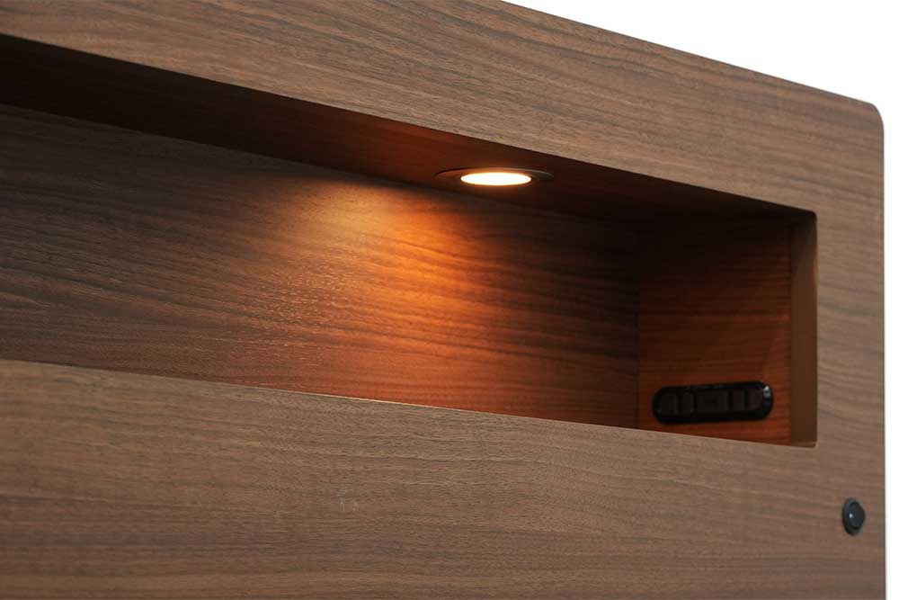This box type headboard is what you have been looking for. It comes with a shelf space with built-in LED lights and outlets for charging smart phones, etc.