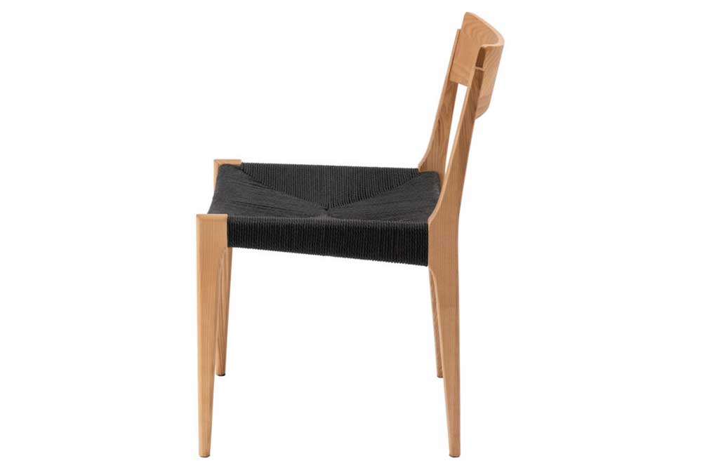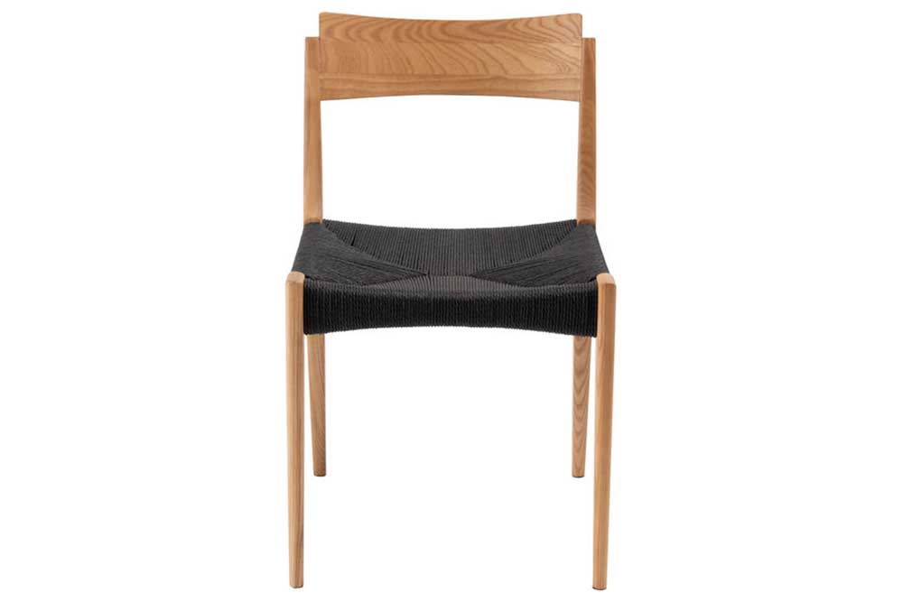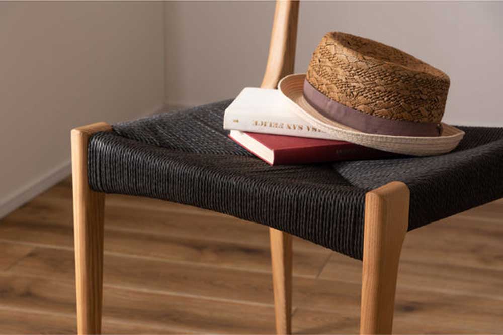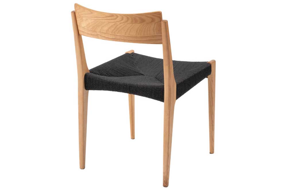 The seat is made of paper cord, which is individually woven by artisans. It features a classic "envelope weave" design, which appears to converge from the four sides of the seat toward the center.