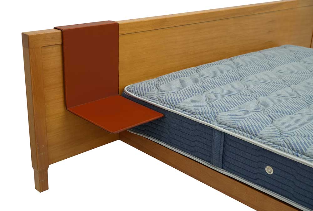This stylish bed has leather tables attached to both sides of the headboard.