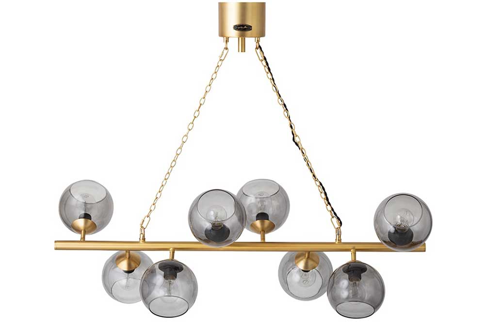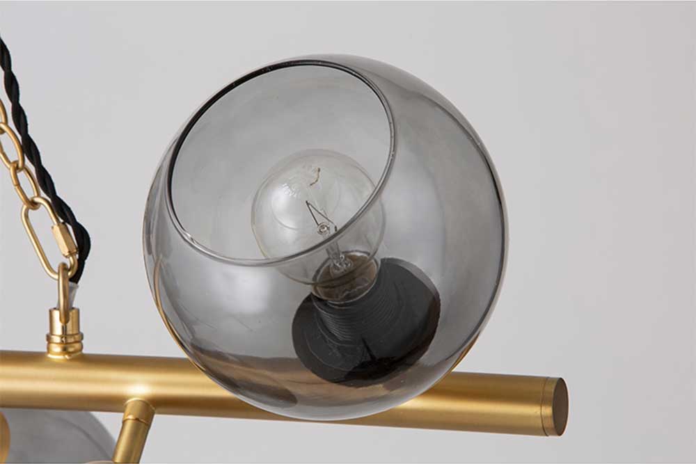 This pendant light will add a touch of elegance to any space. Its dynamic bar design features eight round gray glass shades randomly arranged on a gold support.