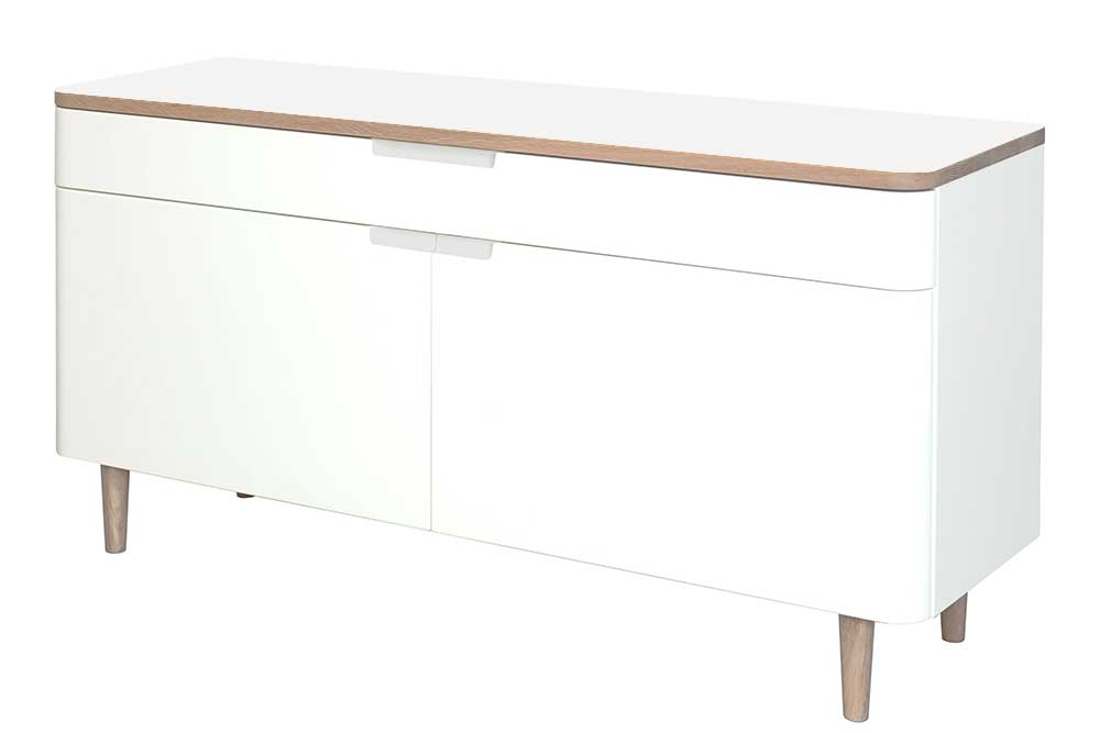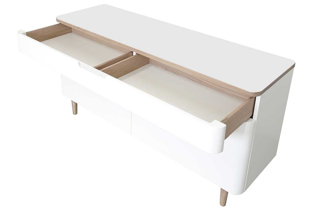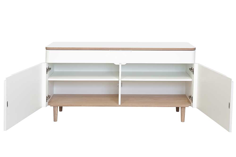 モダンでスタイリッシュな北欧デザイン。すっきりとした曲線、脚・ハンドルの繊細なディテールが上品ですっきりとした空間を演出します。引出しと扉つきの棚を組み合わせた、シンプルで機能性のあるサイドボードです。
