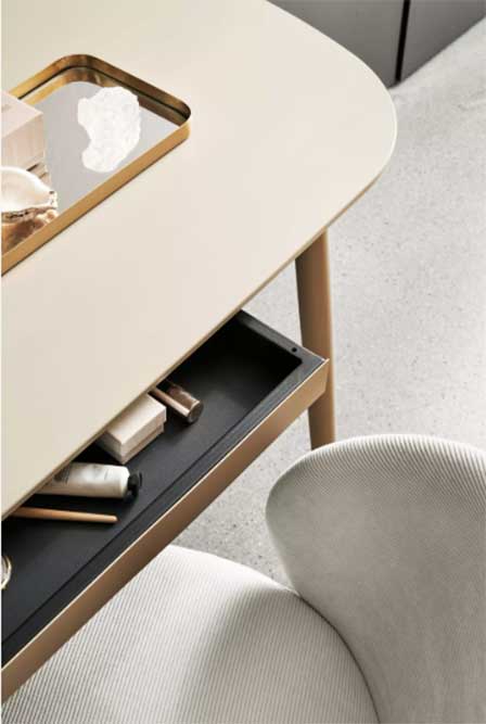 このデスクのテーブルトップの正面は楕円形に近い有機的な形で、ソフトな魅力を放ちます。一方、デスクの背面は直線的なエッジで仕上げられているため、自立させることも、壁につけて配置することもできます。