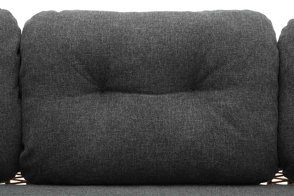 This sofa has a lightweight, water-resistant aluminum frame and teak legs, and the back, seat, and sides are fashionably woven with a special polyester rope that is specifically designed to withstand UV rays. This stylish 3-seater sofa has the natural color of the finely woven rope accentuated by the dark color of the frame.