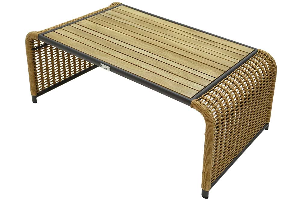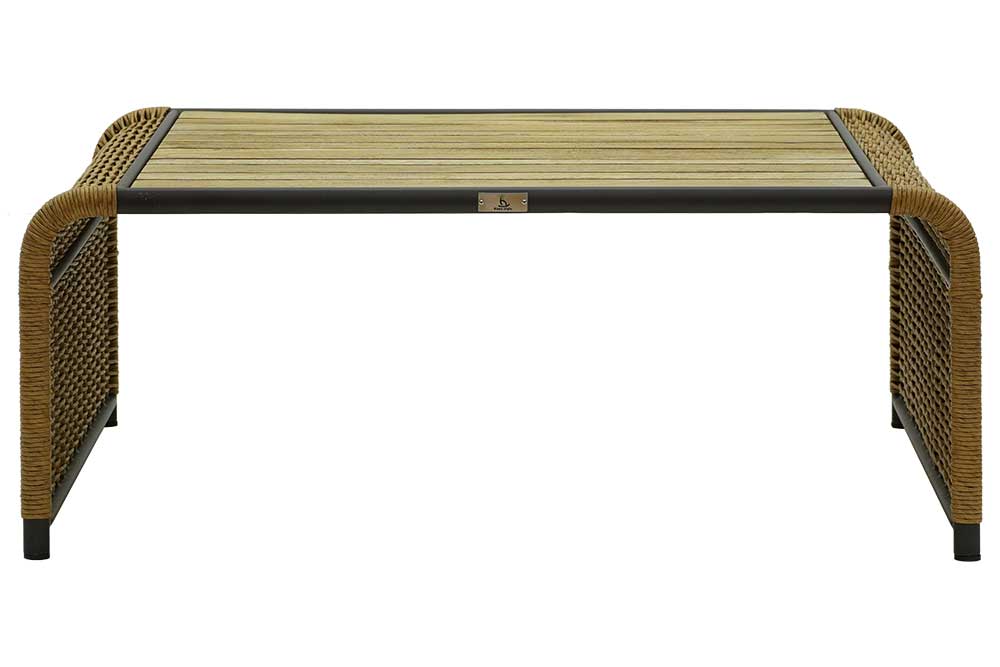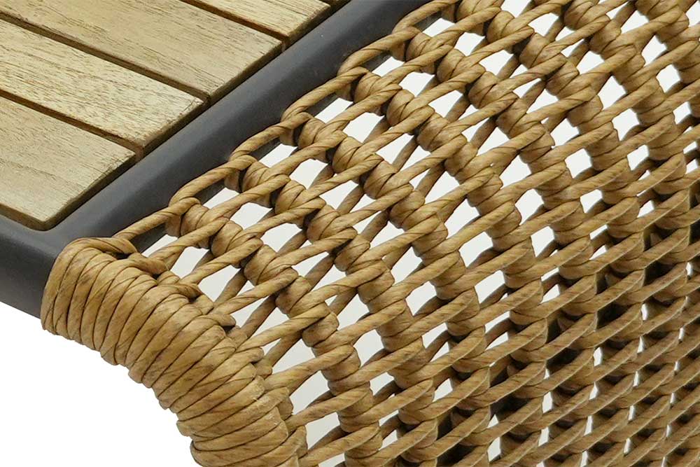 The lightweight, water-resistant aluminum frame has a special polyester rope woven into the sides to resist UV rays. The table top is made of teak wood.
