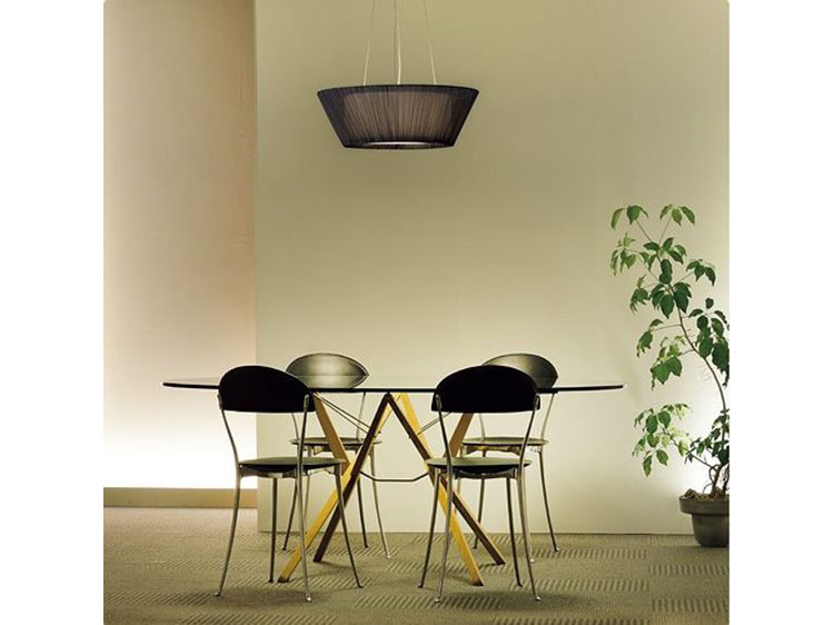 丸型タイプのシーリングとペンダントは、点灯するとプリーツがきれいに透けるデザイン。横から見ると天井へ向かって広がる台形のカタチをしていますので、天井を高く見せる効果もあります。