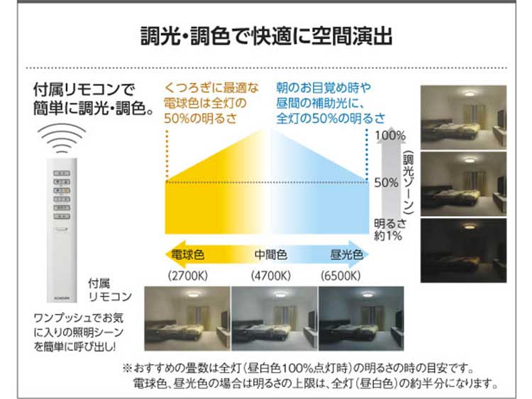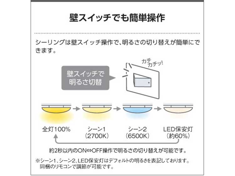 壁スイッチ付き:  全灯→シーン1→シーン2→LED保安灯