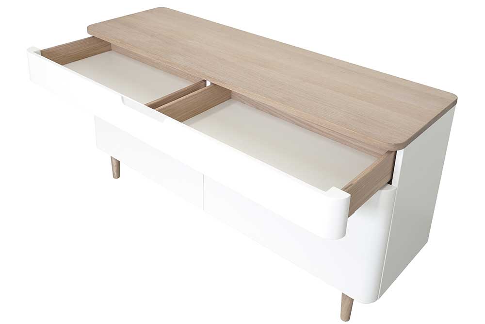 モダンでスタイリッシュな北欧デザイン。すっきりとした曲線、脚・ハンドルの繊細なディテールが上品ですっきりとした空間を演出します。引出しと扉つきの棚を組み合わせた、シンプルで機能性のあるサイドボードです。