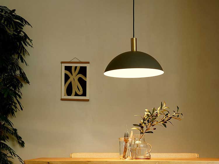 すっきりとしたフォルムが圧迫感を感じさせず、リビングやダイニングなど場所を選ばず、どこにでも合わせやすい汎用性の高い照明です。定番なシルエットに真鍮パーツがアクセントとなり、上質感を演出してくれます。