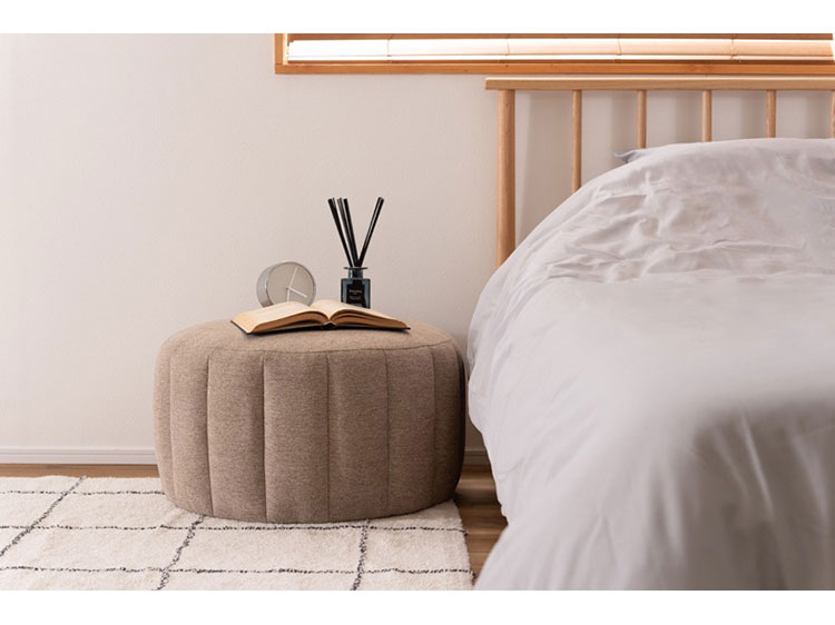 直径60cmの大きさで、コロッとした姿が愛らしい大きめスツール。 優しく淡い色合いのくすみカラーのスツールなので、北欧テイストや韓国インテリアテイストとも好相性。 大きめサイズなのでお部屋の中でもちょっと目を引くワンポイントデザインになります。 座面は沈み込みを抑えたしっかりとした作りなので、ソファ前に置いてオットマンとしても使えます。 また、座椅子やベッドの隣に置いてサイドテーブルとして使っても便利です。