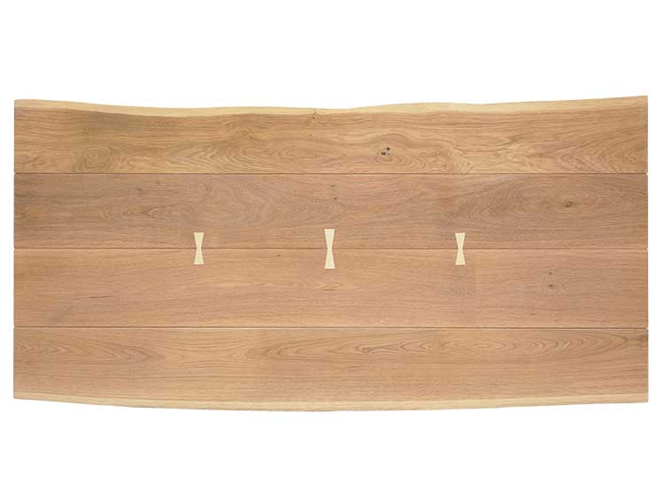 天板は木そのものが持っている曲線を残して一枚の天板に仕上げている。クラックを止める機能を持ちながらデザインのアクセントにもなるチギリが熟練の職人により施されています。