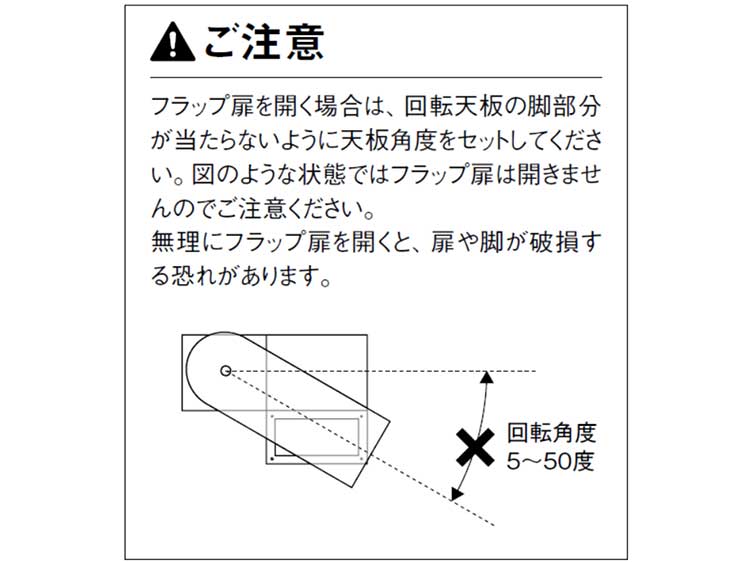 フラップ扉を開く場合は、回転天板の脚部分が当たらないように天板角度をセットしてください。