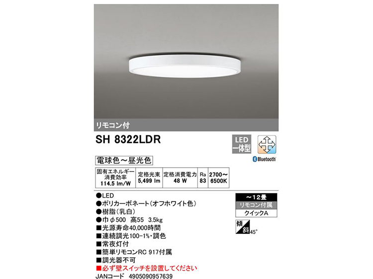 電球: LED 48W  5499lm・114.5lm/W  Ra83  2700K~6500K(交換不可)