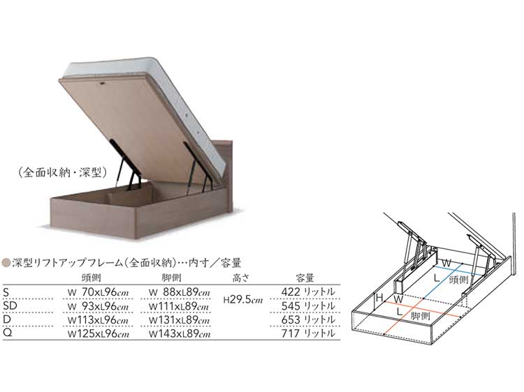 全面収納リフトアップベッドは、取り出し頻度の少ない季節の寝具や衣類などをまとめて収納いただけます。